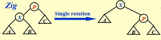 - Zig-zag(之字型): 双旋,使得X成为树根(不一定是树的根,是XPG子树的树根),这种情况与普通方法是一样的,与 AVL 树的 RL 和 LR 型也是一样的
