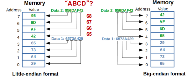 需要注意的是,若是存放ASCII码,例如ABCD,则是先来的先放,因为此时没有most significant bit和least significant bit之分。