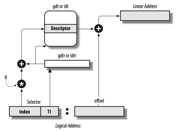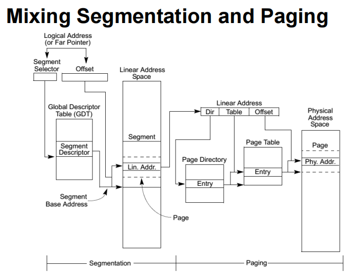 通过分段的方式得到线性地址,此时线性地址就是虚拟地址,然后通过分页的方式得到物理地址(x86的实现)