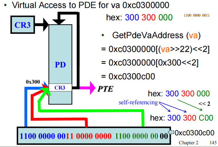 举例来说,Windows 32位系统常用页目录的第 0x300 项作为自引用条目(self-referencing entry),该条目指向页目录自身。