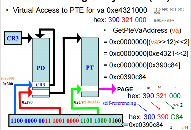 假设我们要修改虚拟地址 0xe4321000 对应的映射关系(即修改它的 PTE)。我们需要构造一个特殊的虚拟地址来“找到”这个 PTE。
