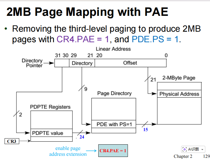- 在启用 PAE 分页(CR4.PAE=1)时,PAE 会自动使用页大小位(PS),此时 CR4.PSE 的值被忽略,仅支持 2MB 的大页。