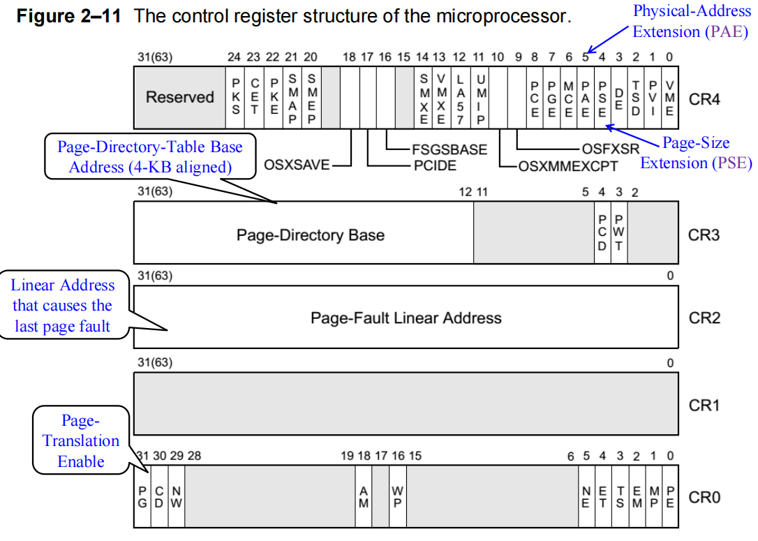 - 当CR4寄存器的PAE位(CR4.PAE)被置为1时,PAE被启用。
