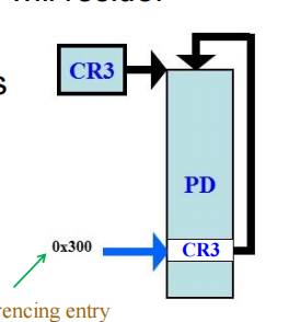 - 我们在页目录 (PD) 中选一个特殊的索引(比如 0x300),让这个 PDE (页目录项) 指向 CR3 所在的物理地址,也就是指向 PD 自己。