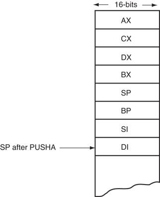 - PUSHA 指令会把内部通用寄存器(除了段寄存器)的内容全部依次压入栈中。