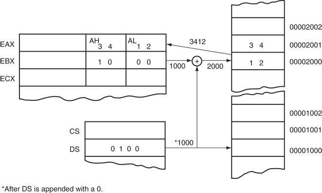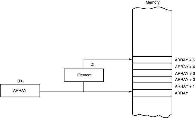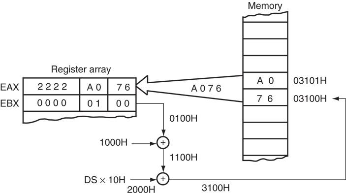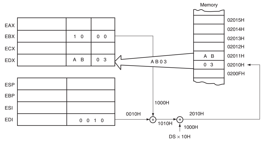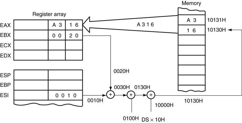 - 在8086到80286处理器中,这种寻址方式可以使用16位寄存器(AX, BX, CX, DX, SP, BP, DI或SI),