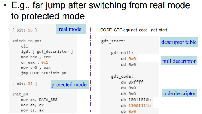 | Task Switch | N/A | 通常通过 Far Jump 触发 | 在保护模式下,跳到 TSS 描述符或其他任务门。 |