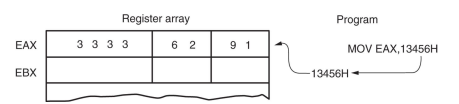 图中展示了指令 MOV EAX, 13456H 的执行过程:指令将立即数 13456H(十六进制数)直接加载到寄存器 EAX 中。