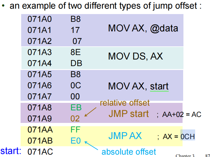 JMP NEAR PTR [BX]表示跳转到数据段(data segment)中,偏移地址由BX寄存器指定的内存位置。- 在这个偏移地址存储着一个16位数值,这个数值被作为段内跳转(intrasegment jump)的偏移地址。
