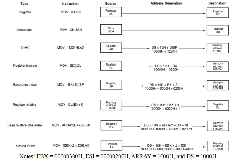 下图展示了使用 MOV 指令时所有可用的数据寻址方式的变体。