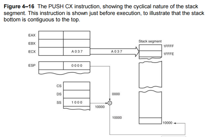 PUSH CX 指令展示了栈段的循环特性。