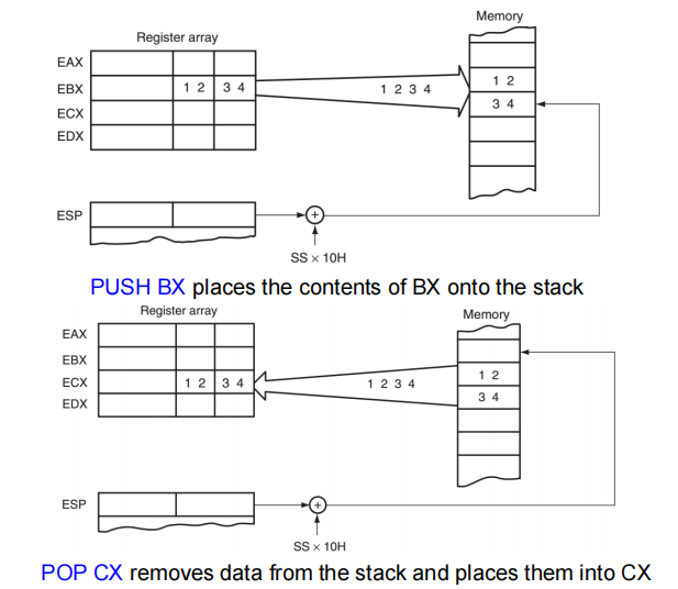 - 数据通过 PUSH 指令压入栈顶,通过 POP 指令从栈顶弹出。