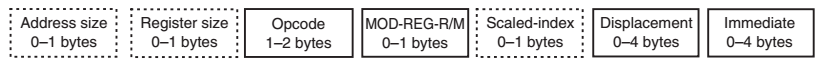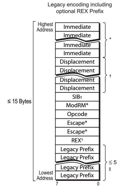- 指令的总长度必须小于或等于15字节。如果超过该限制,将会触发通用保护异常(general-protection exception)。