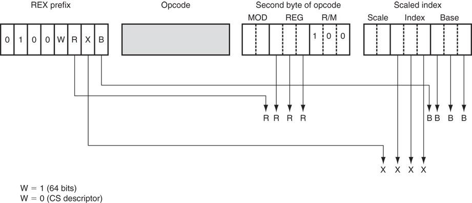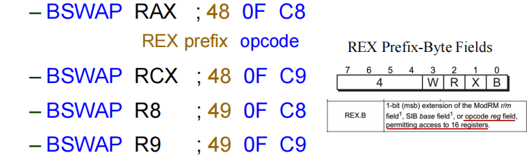 - REX并不是一个唯一的数值,而是一个范围(40h 到 4Fh),位于其他前缀之后、操作码之前。