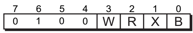 REX 前缀包含五个字段。高半字节用于唯一标识 REX 前缀。低半字节被分为四个位(W、R、X 和 B),每个位各占一位。