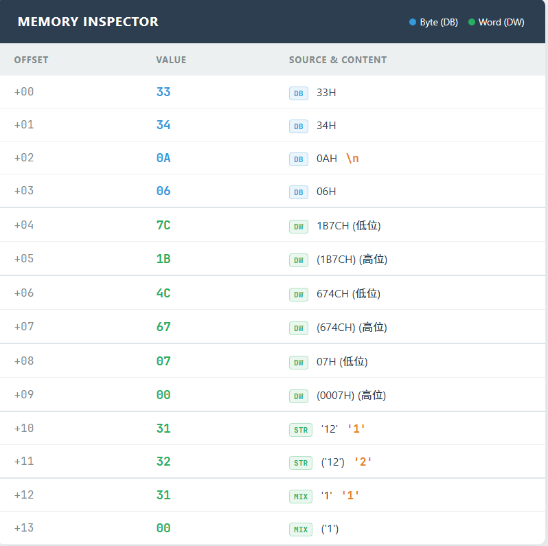 name ENDS中的名字一致。 - [readonly] (只读属性): 可选。如果指定,表示该段内的内容是只读的。汇编器会检查是否有指令试图修改该段内的内容。