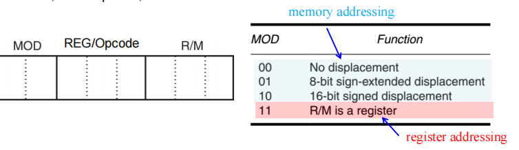 - 如果 MOD 字段为 11(二进制),则选择寄存器寻址模式(register addressing mode).寄存器寻址是指使用 R/M 字段指定的寄存器作为操作数,而不是内存位置。