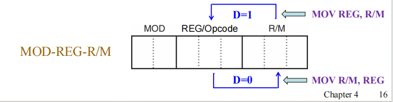 - 若D=0, 数据流向R/M字段来自寄存器(REG 字段)。