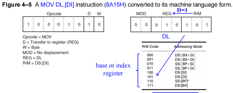 该指令共 2 字节,包含 op-code 100010,D=1(数据从 R/M 流向 REG/Opcode),W=0(字节操作),MOD=00(无displacement),REG/Opcode=010(DL),R/M=101([DI])。