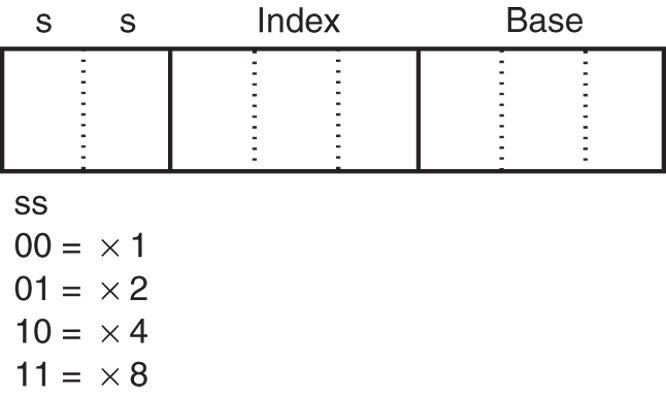 最左侧的 2 位用于选择缩放因子(乘数),其取值可以为 1x、2x、4x 或 8x。 缩放索引寻址同样允许对单一寄存器应用缩放因子进行乘法运算。
