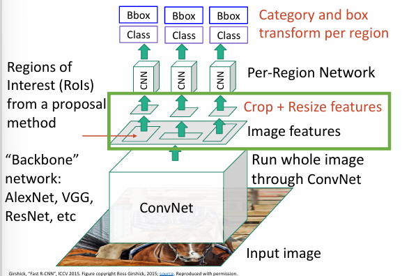 区域提议(Region Proposal) :使用选择性搜索(Selective Search)算法生成约2000个可能包含物体的候选区域。