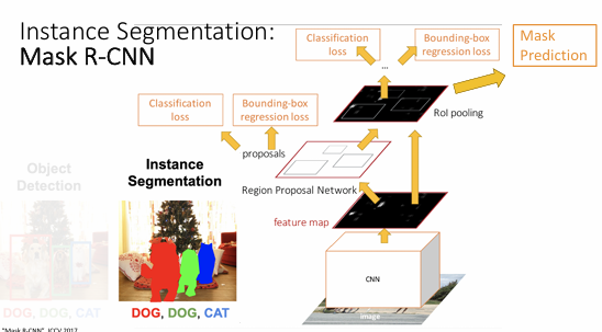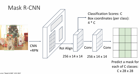即再输出了box和class之后,还会输出mask,共有C个通道,每个通道对应一个物体的mask,每个mask的大小为H×W,即与原图的大小相同;即在某个像素中,如果属于物体A的通道的值比较高,那么这个像素被归于物体A;