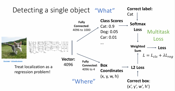 首先输入图片到一个预训练的CNN模型(Tranfer Learning),然后得到一个特征向量,将其通过两个神经网络分别得到分类结果和位置结果(一般是四个值,x,y,w,h,表示中心坐标和宽高)。将两个结果分别计算损失函数,然后相加,再加上正则化项,得到总的损失函数。