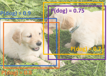 在上图示例中,多个框检测到同一只狗,置信度分别为0.9、0.8、0.75和0.7。