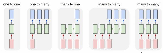 Recurrent Neural Networks (RNNs) 循环神经网络是一种特殊的神经网络,它能够处理序列数据。对于一般的前馈神经网络,输入和输出是one-to-one的关系,而对于RNNs,输入和输出可以是one-to-many, many-to-one, many-to-many的关系。