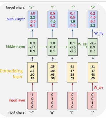 例如现在字典有[h,e,l,o],使用字符串"Hello"训练一个语言模型来预测下一个字符;