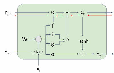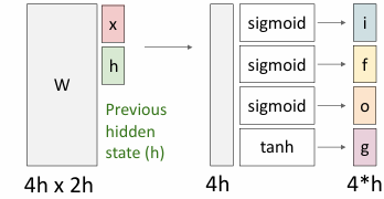 首先执行\((4h \times 2h)\times (2h \times 1)\)的映射,然后对应应用sigmoid或者tanh函数,得到四个门,再与\(c_{t-1}\)和\(g_t\)相乘加上\(i_t\)乘\(g_t\),得到\(c_t\),最后通过\(o_t\)和\(\tanh(c_t)\)得到\(h_t\)。