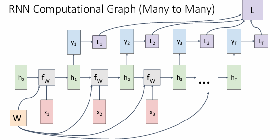 对于多对多的情况,例如语言预测模型,每一个输出都依赖当前的输入和前一个隐藏状态。得到输出之后,再计算损失,最后每个输出的损失结合在一起,得到总的损失。