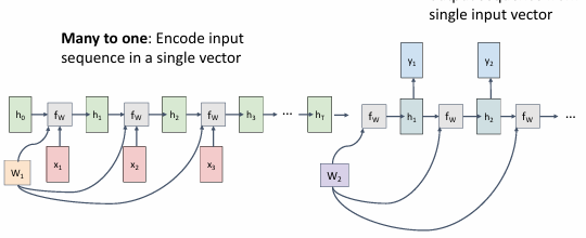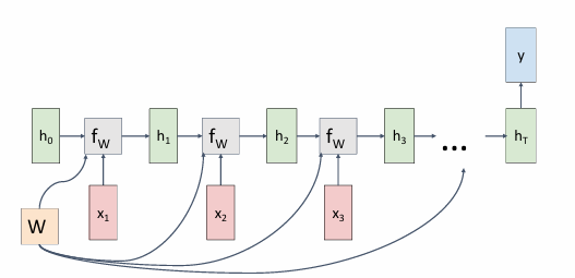 其中,\(h_t\) 是RNN的下一时刻的隐藏状态,\(x_t\) 是输入,\(f_W\)是激活函数。例如tanh函数。当然一般也会包含偏置项\(b_h\)。
