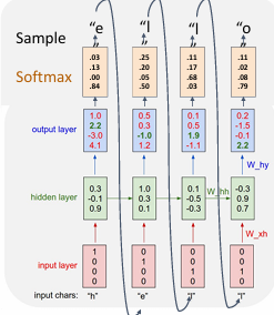 - 给输入'hel',将输出与'l'比较,计算损失,然后更新参数。