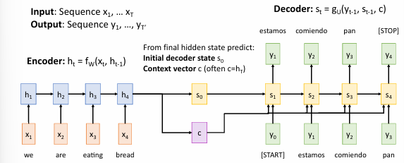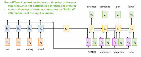 得到\(c_t\)后,再和\(y_t\)进行运算,得到下一阶段的\(s_{t+1}\)。然后再重复上述过程,直到生成结束符。