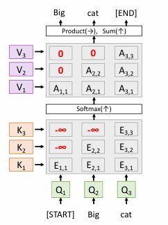 在计算注意力权重时,使用遮掩矩阵将未来的词的相似度设置为负无穷大。这确保了 softmax 输出的注意力权重为零,从而忽略未来的信息。