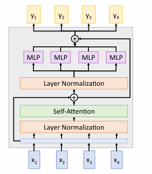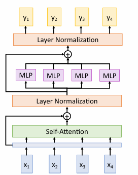 输出: - 最终输出 \( y_1, y_2, y_3, y_4 \) 是经过自注意力和前馈网络处理后的结果。