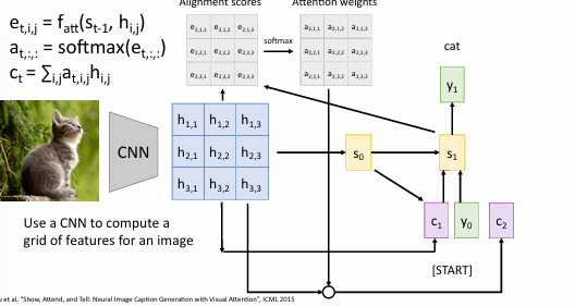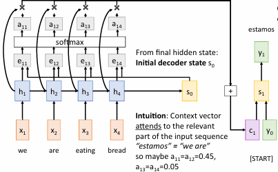 例如,一开始,将\(s_0\)和每个\(h_i\)进行运算,得到\(e_{1i}\),然后进行softmax运算,得到\(\alpha_{1i}\),然后根据\(\alpha_{1i}\)和对应的\(h_i\)求数学期望,得到最后的\(c_1\)。