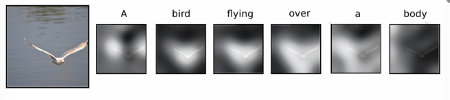 生成图像字幕时,每一个单词对图像的每个区域的关注度也不一样(在这里越亮代表注意力越大)