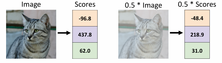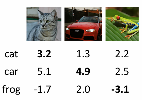 Notice also that we think of the input data \((x_i,y_i)\) as given and fixed, but we have control over the setting of the parameters \(W,b\). Our goal will be to set these in such way that the computed scores match the ground truth labels across the whole training set. we wish that the correct class has a score that is higher than the scores of incorrect classes.