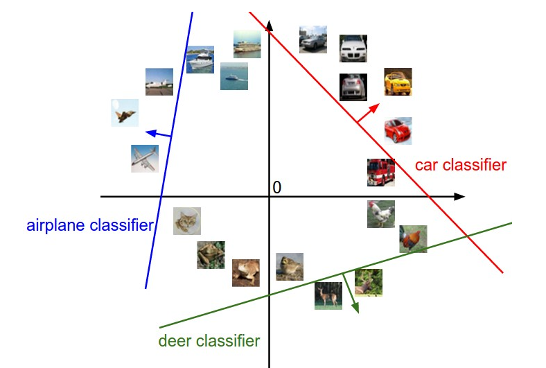 Cartoon representation of the image space, where each image is a single point, and three classifiers are visualized. Using the example of the car classifier (in red), the red line shows all points in the space that get a score of zero for the car class. The red arrow shows the direction of increase, so all points to the right of the red line have positive (and linearly increasing) scores, and all points to the left have a negative (and linearly decreasing) scores.