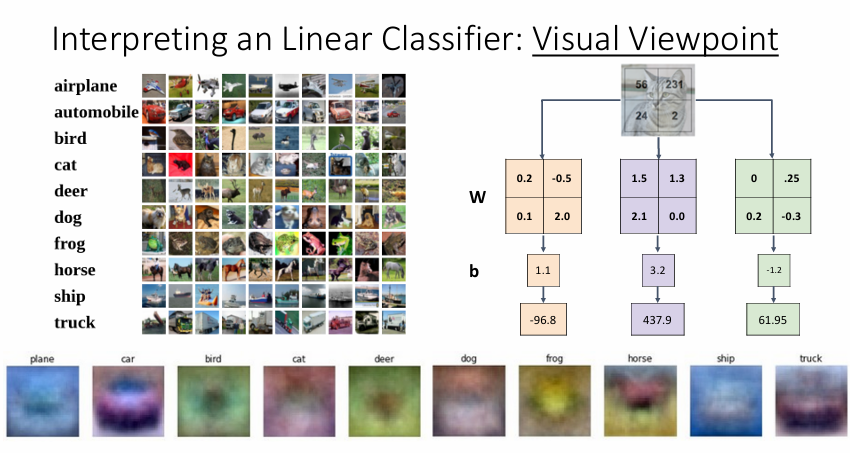 As we saw above, every row of \(W\) is a classifier for one of the classes. The geometric interpretation of these numbers is that as we change one of the rows of \(W\), the corresponding line in the pixel space will rotate in different directions. The biases \(b\) , on the other hand, allow our classifiers to translate the lines. In particular, note that without the bias terms, plugging in \(x_i=0\) would always give score of zero regardless of the weights, so all lines would be forced to cross the origin.