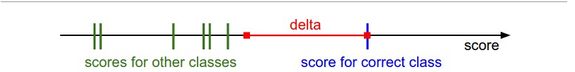 For example,if \(\Delta = 1\),and the score of the correct class is 13,then any score below 12 will contribute 0 to the loss.Any score above 12 will contribute to the loss.