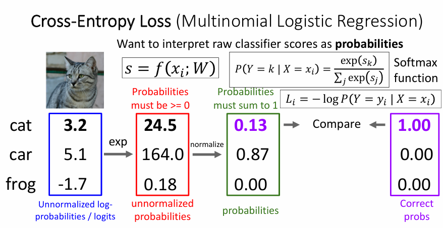 The Softmax classifier is hence minimizing the cross-entropy between the estimated class probabilities(i.e. the output of the Softmax function)and the “true” distribution, which in this interpretation is the distribution where all probability mass is on the correct class (i.e. \(p=[0,0,...1,...,0]\) contains a single 1 at the \(y_i\)-th position).