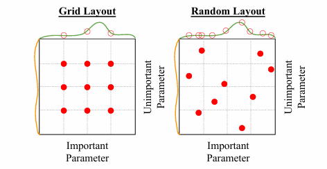 空间上的点代表超参数的组合,绿色的曲线代表其中一个超参数对于结果的影响,橙色的曲线代表另一个超参数对于结果的影响。可以看到,如果使用Grid Search,那么对于绿色曲线比较难找到比较好的超参数,而如果使用Random Search,那么就可以找到比较好的超参数。,因为它覆盖了更多的情况。