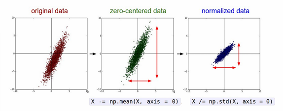 如果不进行以上两步的处理,首先有可能会出现之字形下降的问题,其次如果说classifier穿过原点,而数据在离原点很远的地方,那么其对于微小变化会非常敏感,从而导致模型不稳定,也难以优化