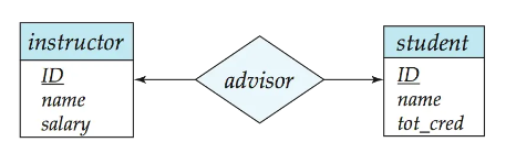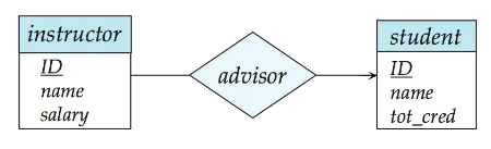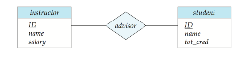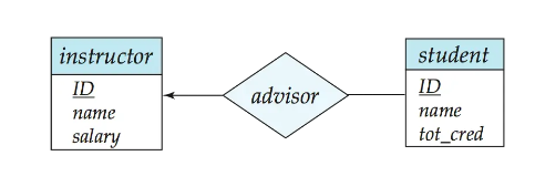 - 一个二元关系集,表示两个实体集之间的关联;特别的,Relationship sets that involve two entity sets are binary (or degree two).