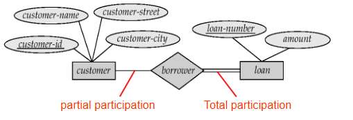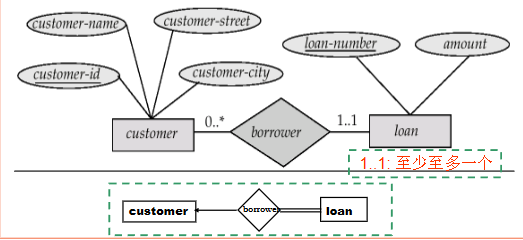 在loan的上方有1..1代表每个loan至多至少参与一个borrow关系,而customer的上方有0..*代表每个customer可以不参与任何borrow关系,也可以参与多个borrow关系;