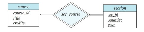 在课程-章节的例子中,course就是强实体集,也是section的依赖实体集(标识实体集),section就是弱实体集,course_section就是标识关系集。