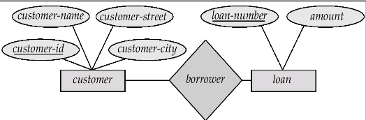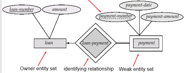 一个另外的常见的例子是贷款和还贷,loan是强实体集,也是payment的依赖实体集,payment就是弱实体集,loan_payment就是标识关系集。